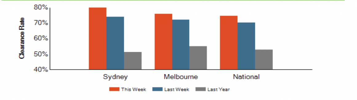 Historically this level of auction clearance rates have been consistent with annualised house price growth in the order of 15-20 per cent in both cities.